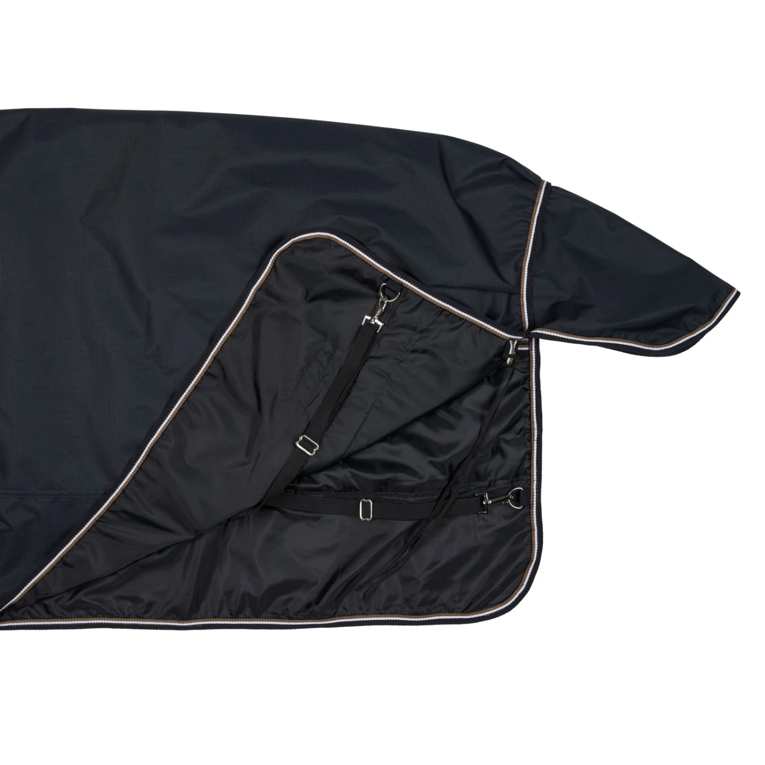 Diese Decke besteht aus wasserdichtem, atmungsaktivem Material. Die gute Passform an Hals und Schultern macht sie bequem und die hohe Gehfalte sorgt für Bewegungsfreiheit. Frontverschlüsse, Kreuzgurte, Beinschnüre und Schweiflatz sichern die Decke und bieten vollen Schutz.