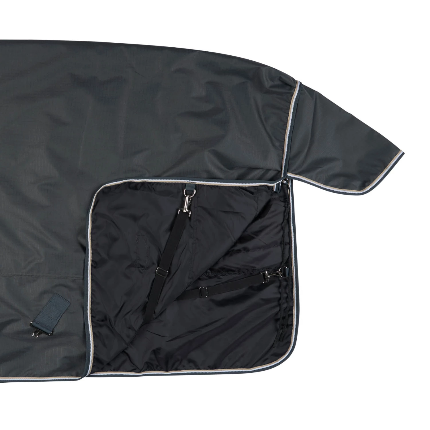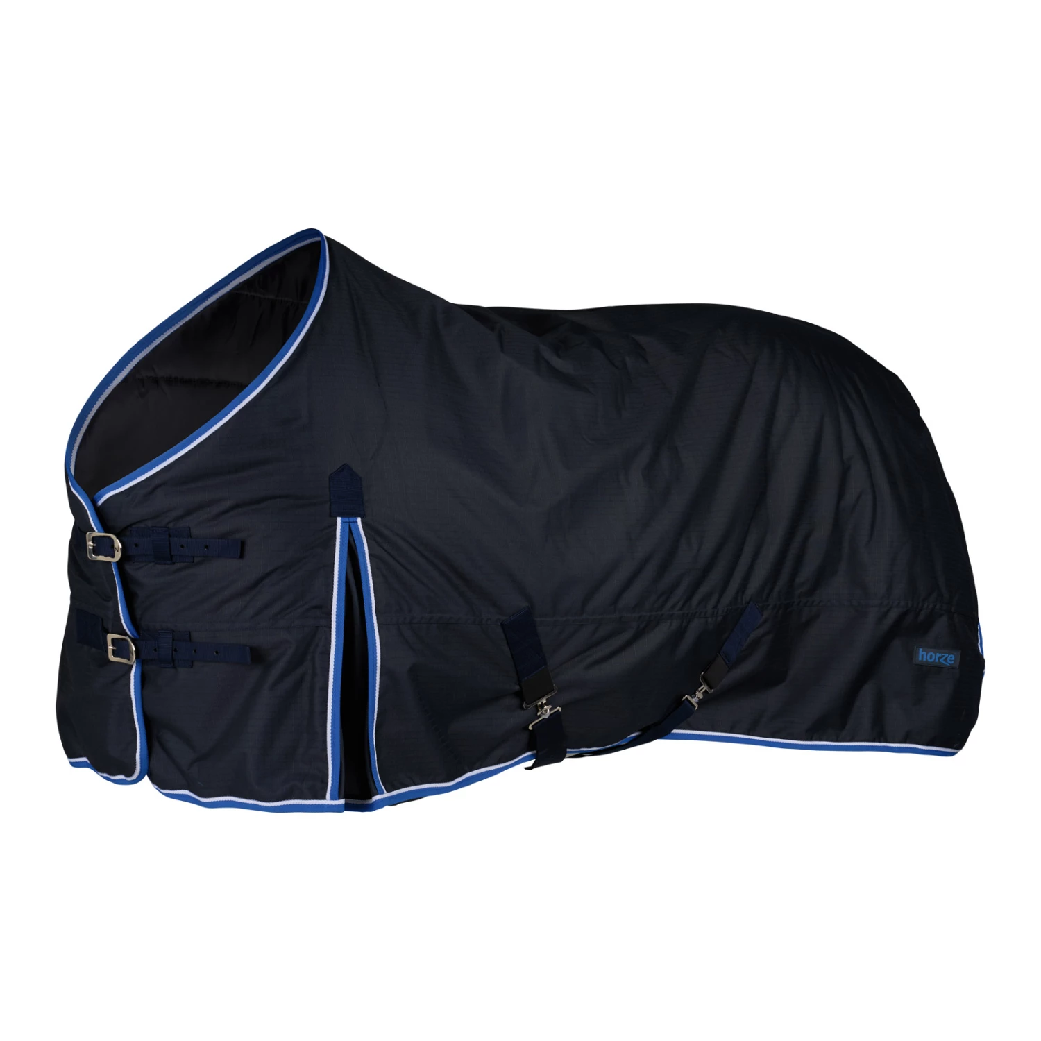 Diese Decke ist aus wasserdichtem, atmungsaktivem Material gefertigt. Der gute Sitz an Hals und Schultern macht sie bequem und die hohen Gehfalten bieten Bewegungsfreiheit, damit sich dein Pferd austoben kann und nicht eingeschränkt wird. Frontverschlüsse, Kreuzgurte und Beinschnüre halten die Decke sicher an ihrem Platz und verhindern Verrutschen.