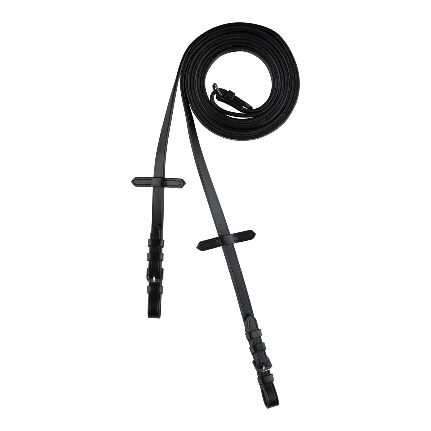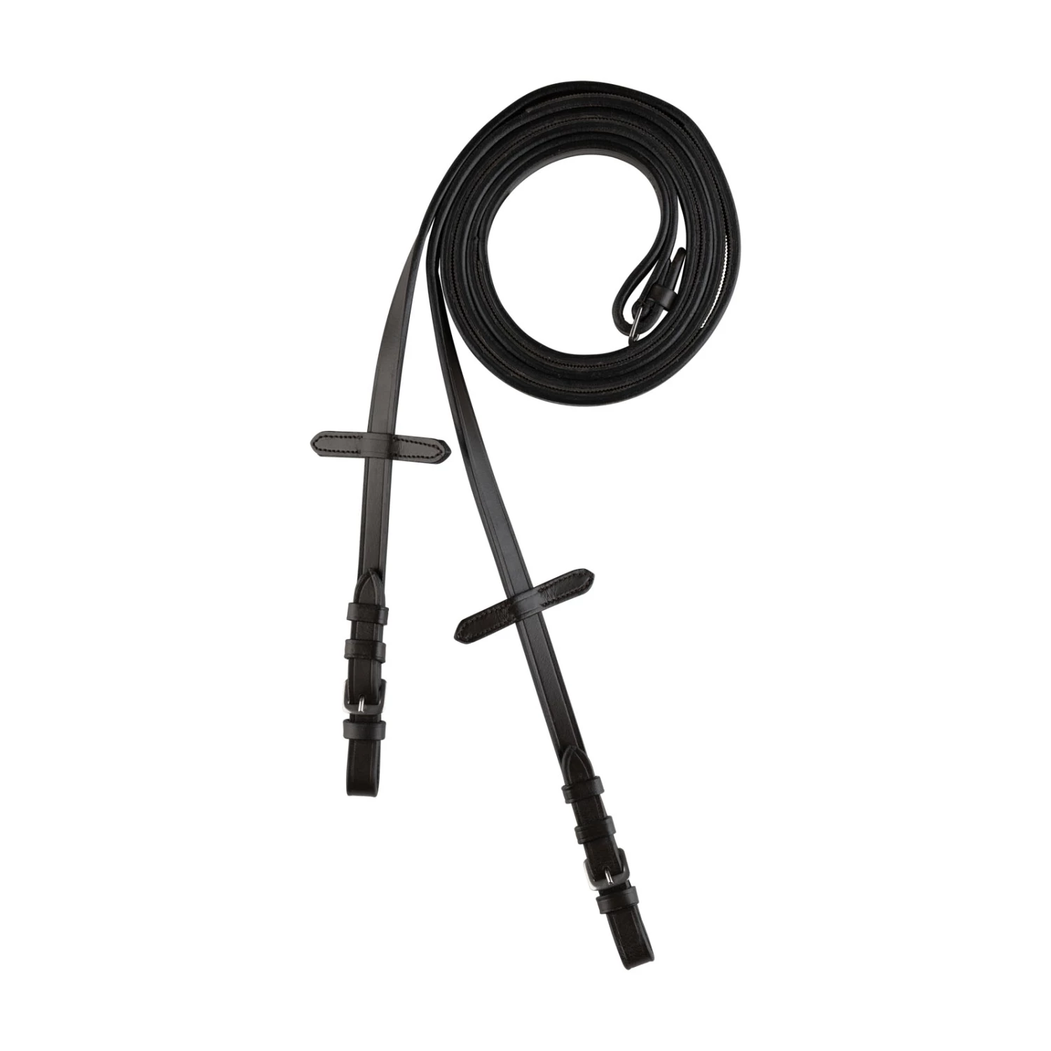 Diese schmalen Zügel bestehen aus Leder mit Gummi auf der Innenseite, das für einen sicheren Halt und einfaches Säubern sorgt. Die rostfreien Stahlschnallen sind robust und leicht an jeder Trense zu befestigen.